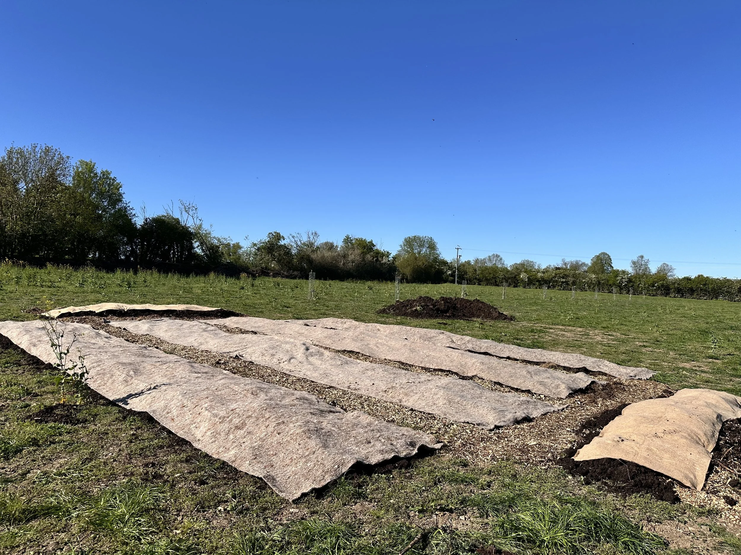 The volunteers have prepared six growing beds ready for the seedlings. The beds are no dig beds of well rotted horse manure and farm made compost. We have covered with sheep wool felt to keep the moisture in - the seedlings will be planted through the felt while still in their cardboard pots.
